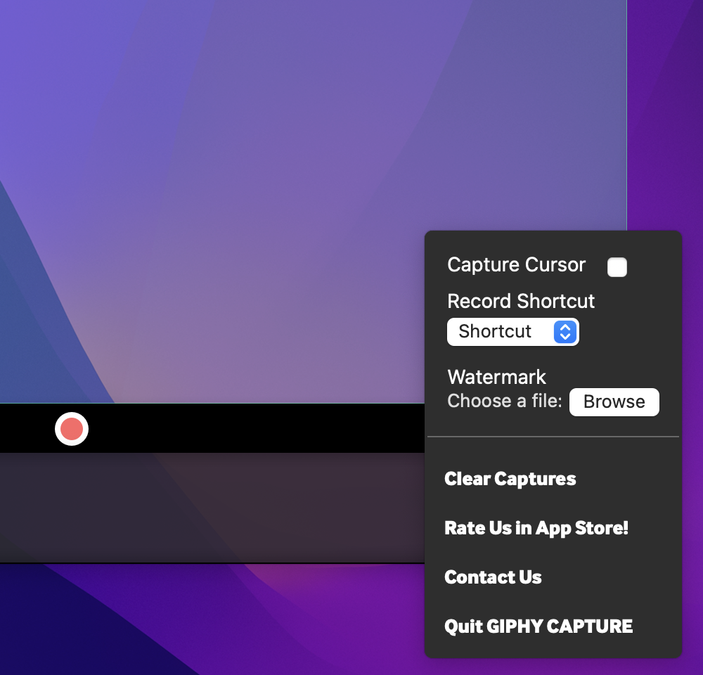 GIPHY Capture 녹화 전 환경설정으로는 Capture Cursor, Watermark 설정 등이 있습니다. Capture Cursor를 체크하면 마우스 커서가 보이는 기능입니다.