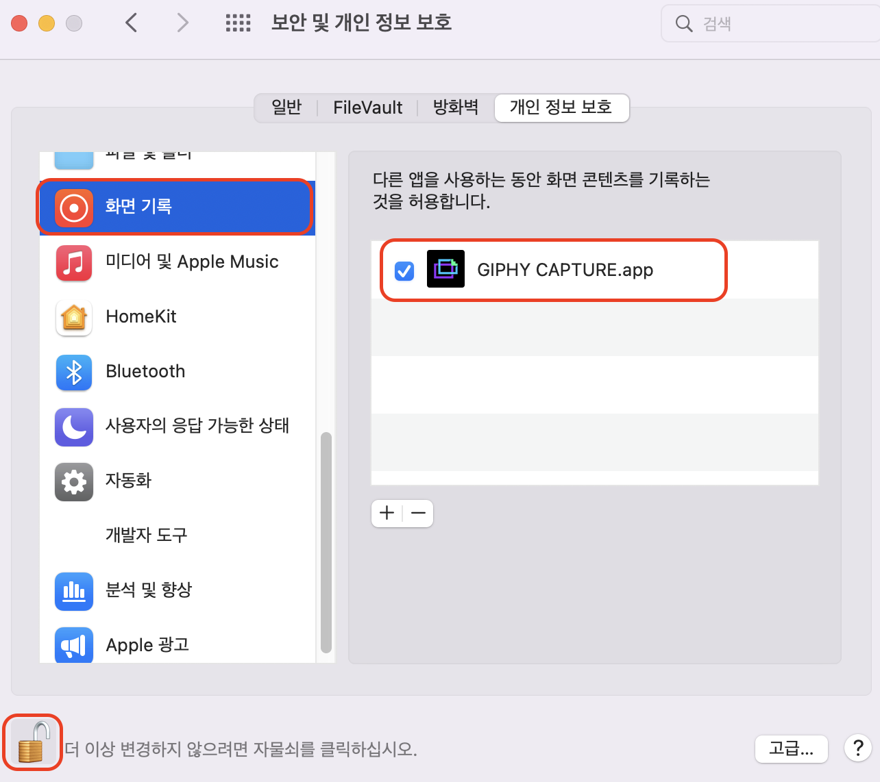 시스템 환경 설정 → 보안 및 개인 정보 보호 → 화면 기록 → GIPHY Capture 체크해주세요. 체크가 막혀있다면 좌측 하단의 자물쇠 아이콘을 풀어주세요.