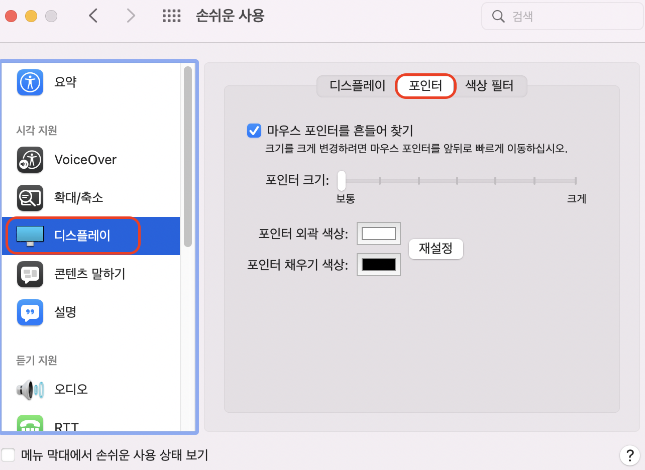 손쉬운 사용 창 왼쪽 메뉴에서 디스플레이를 선택하고 오른쪽 메뉴에서 포인터 탭을 선택합니다.