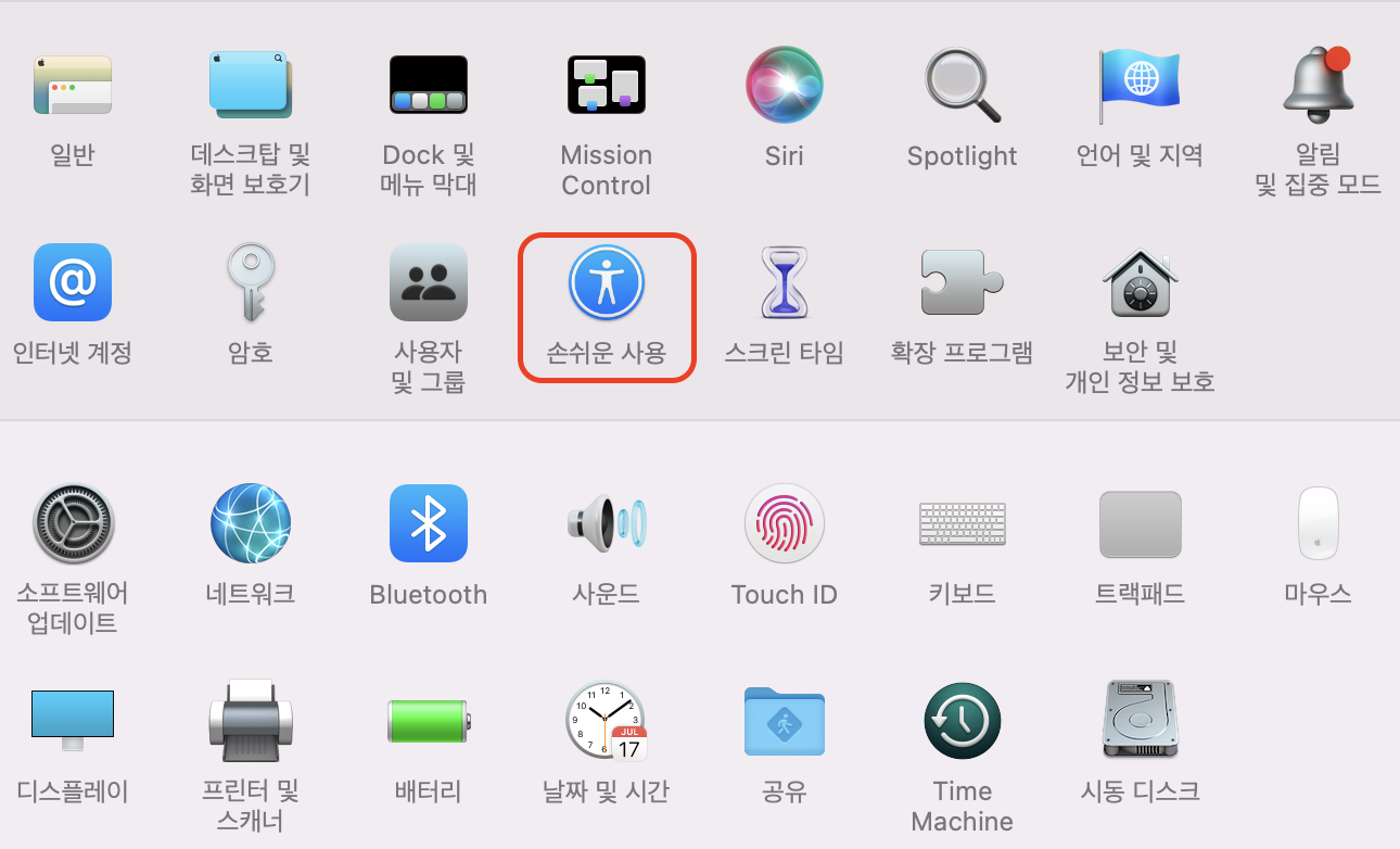 맥(Mac)의 시스템 환경설정에 들어가서 손쉬운 사용를 선택해주세요.