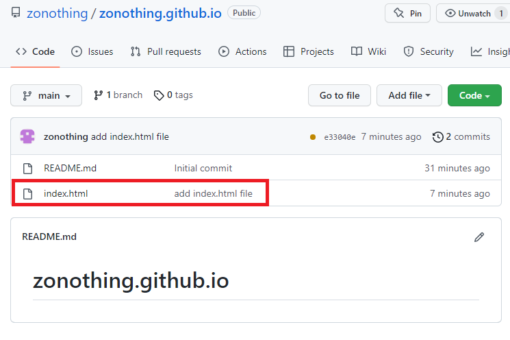 다시 Repository로 돌아와보면 index.html이 추가된 것을 확인할 수 있습니다.