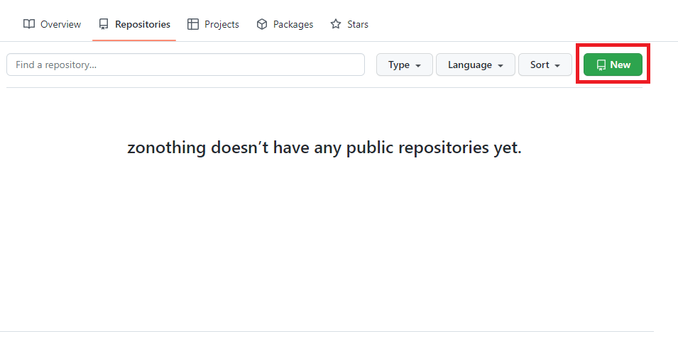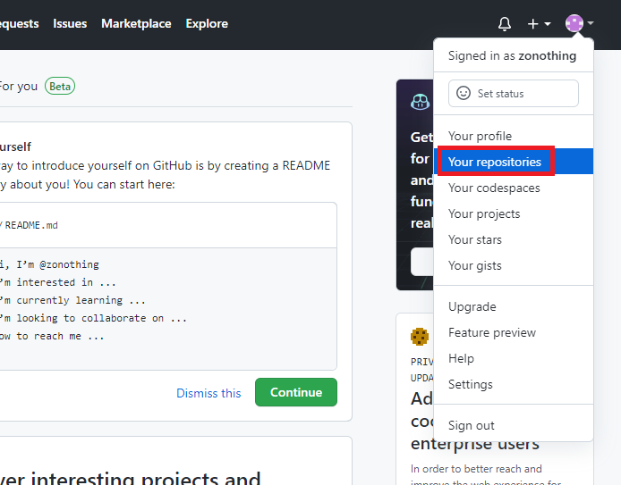 이제 새로운 Repository를 추가해야합니다. 로그인한 이후 우측 상단의 계정 아이콘을 누른 뒤 Your repositories 메뉴를 클릭합니다.