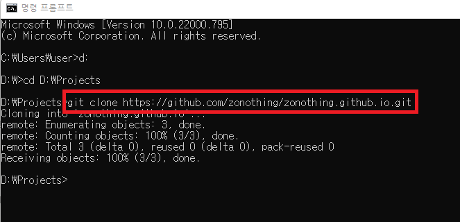 이제 터미널/CMD창을 열어줍니다. 이후 자신이 복사하고 싶은 경로로 이동한 다음, git clone URL을 입력해줍니다. URL은 위에서 복사한 주소입니다!