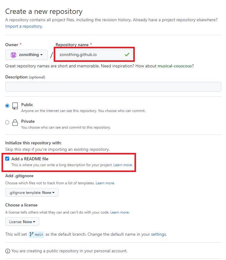 Repository name은 GitHub 계정의 username.github.io으로 만들어 줍니다. 저의 경우 계정의 user name이 zonothing이기 때문에 zonothing.github.io를 입력했습니다.