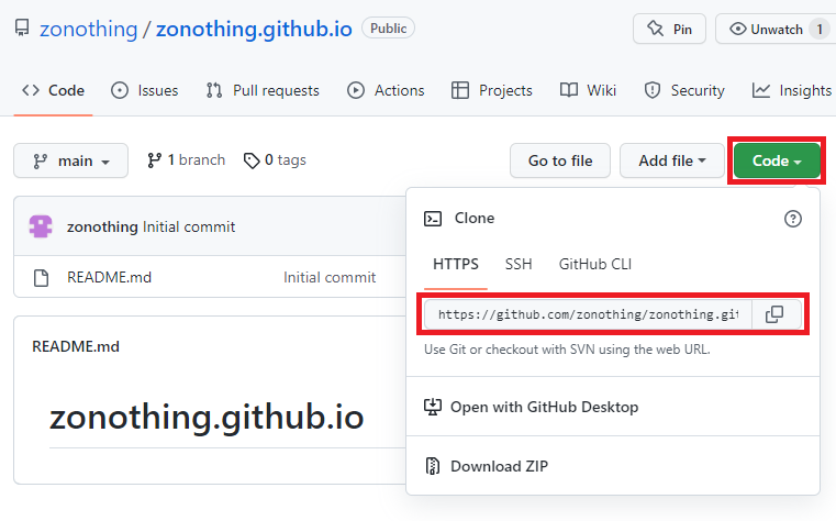 짠! Repository가 정상적으로 생성되었습니다. 이제 Code 메뉴를 눌러서 HTTPS 주소를 복사해줍니다.