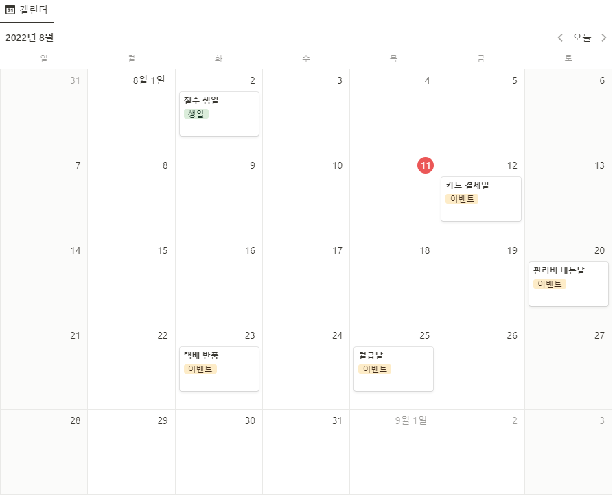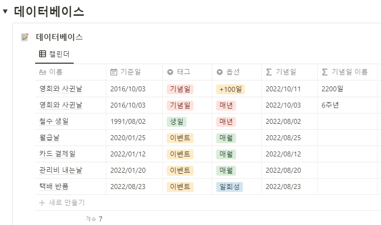 하단에 데이터베이스 파트가 있습니다. 해당 표에 기념일을 기록하면 캘린더에 나타납니다.