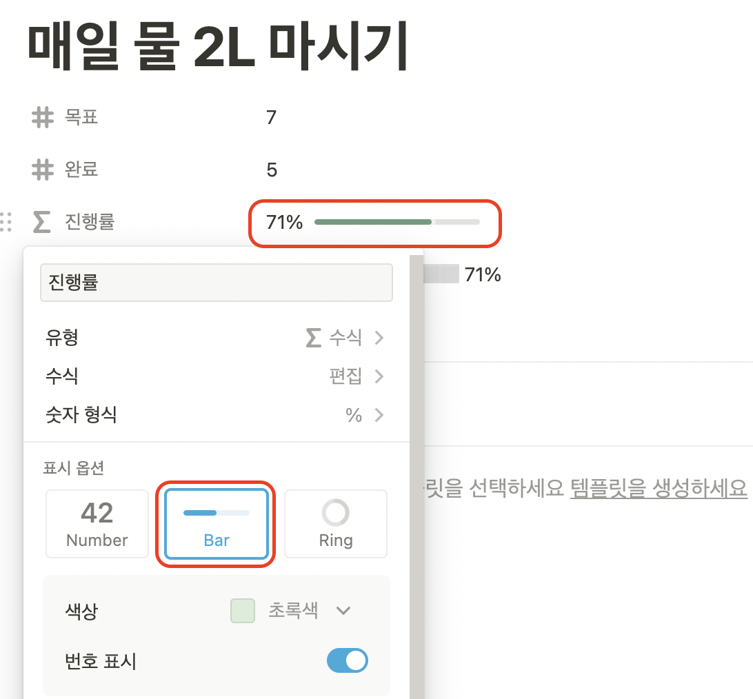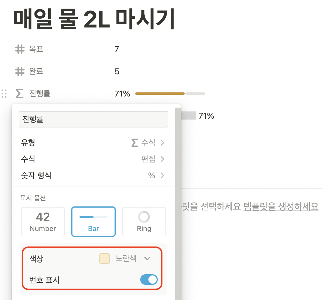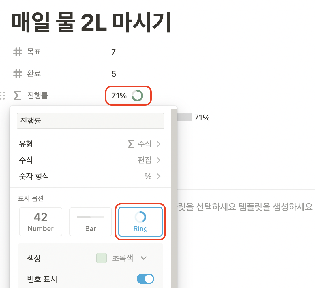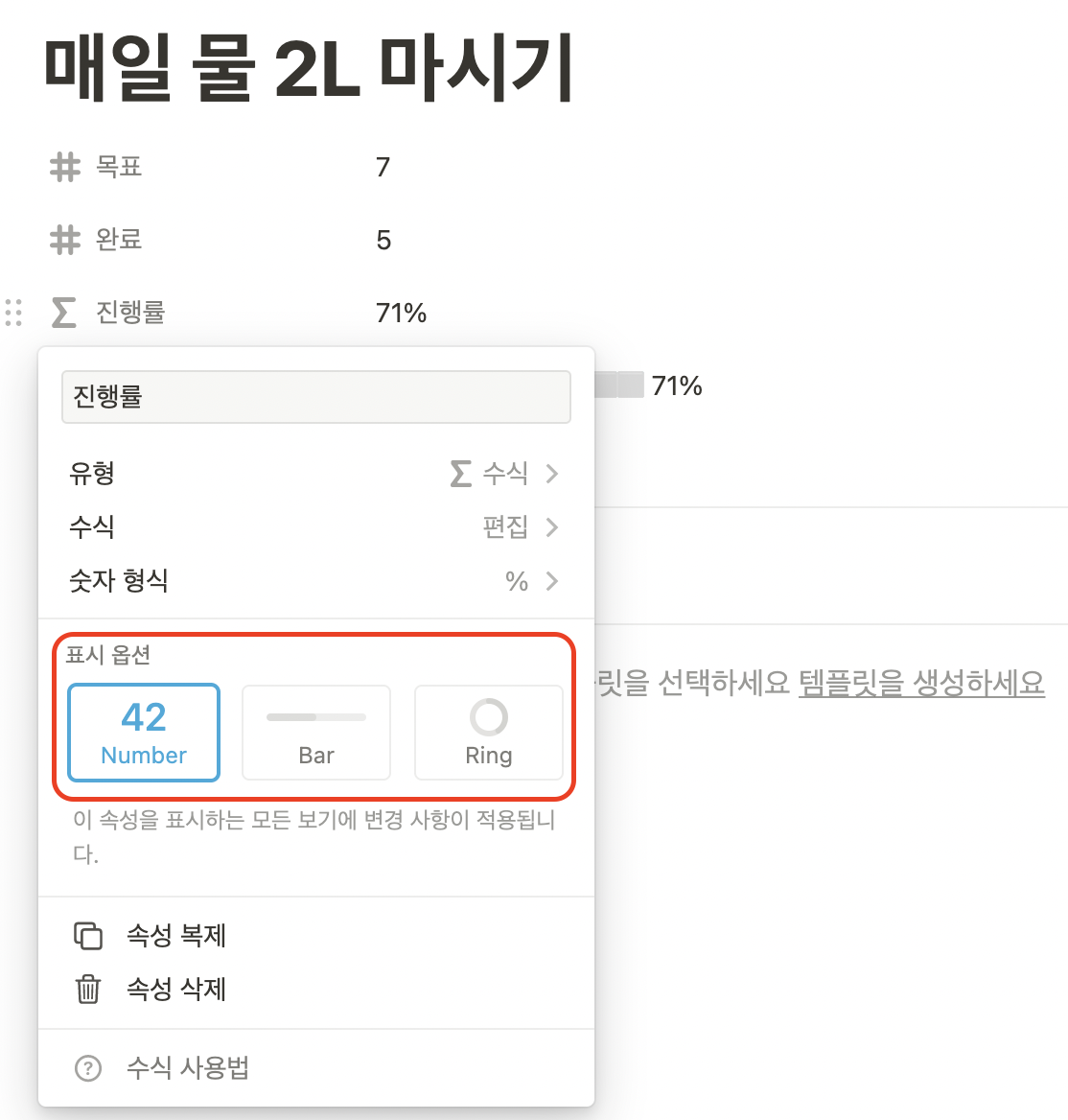 숫자 또는 수식 등 숫자로 표현되는 속성에 대한 편집을 들어오면 표시 옵션이 생겼습니다. Number, Bar, Ring이 존재하는데요.