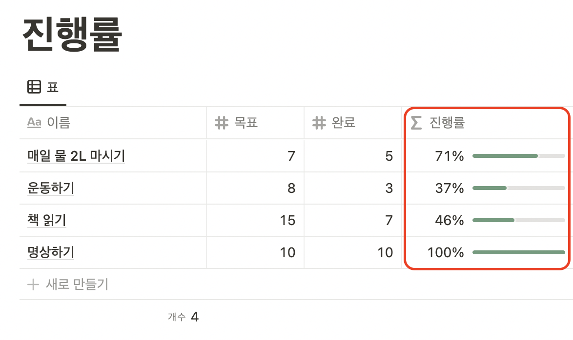 노션(Notion)을 활용하여 습관 트래커를 구현하면 목표를 설정하고 완료한 개수를 파악하할 수 있는데요. 이때 본인이 얼만큼 달성했는지 퍼센트(%) 또는 프로그레스바(Progress Bar)로 표시하면 보다 깔끔하고 직관적으로 구현할 수 있습니다. 이번 포스팅에서 진행률을 직관적으로 표시하는 방법에 대해서 알아보겠습니다.