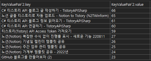 제 티스토리 블로그를 기준으로 1번째 페이지의 Post Id를 가져온 결과값입니다. 정상적으로 Post Id를 가져오는 것을 알 수 있습니다.