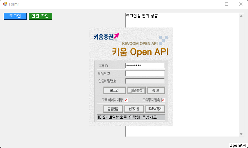 로그인 버튼을 누른 결과입니다. 키움증권 로그인 창이 출력됩니다.