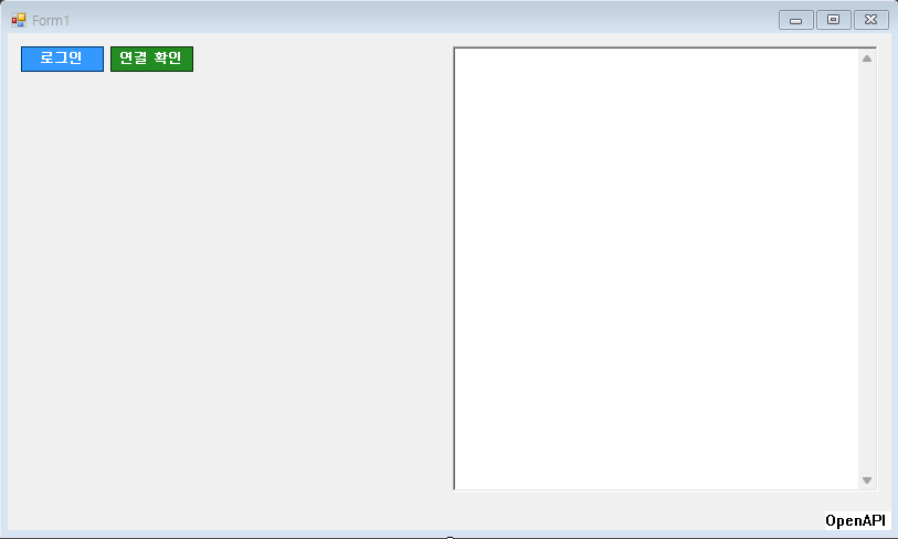 본격적으로 키움증권 API를 활용한 동작을 구현해보도록 하겠습니다. 로그인, 연결 확인 기능을 만들기 위해 Button 2개와 로그를 보여줄 RichTextBox를 추가합니다.
