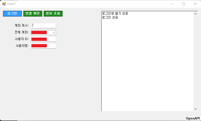 로그인 창 띄우기 → 로그인 성공 → 연결 확인 결과입니다.