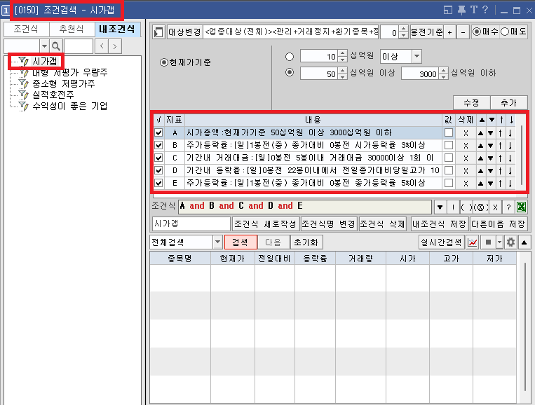 조건식은 우선 키움증권 HTS(영웅문4)에서 설정할 수 있습니다. 화면 번호 “0150”에서 조건식을 본인이 원하는 조건에 맞게 설정하면 해당 조건에 맞는 종목들을 검색할 수 있습니다.